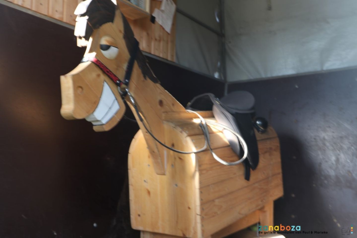 We gaan snel door naar de volgende cache die ons is aangeraden. Maar niet nadat we eerst gaan genieten van een kop koffie. Want het is toch wel belangrijk dat zo nu en dan het vocht wordt aangevuld. Goonies Revenge! Rodeo heet deze cache. Na hetgeen we eerder hebben gezien, zijn de verwachtingen toch wel hooggespannen. En die verwachtingen worden meer dan waargemaakt. We zien een paardentrailer staan, waarvan de kentekenplaat het nummer van de cache is. Hoezo oog voor detail. Met behulp van de code in de listing openen we de trailer en hierin zien we een heus rodeopaard staan.