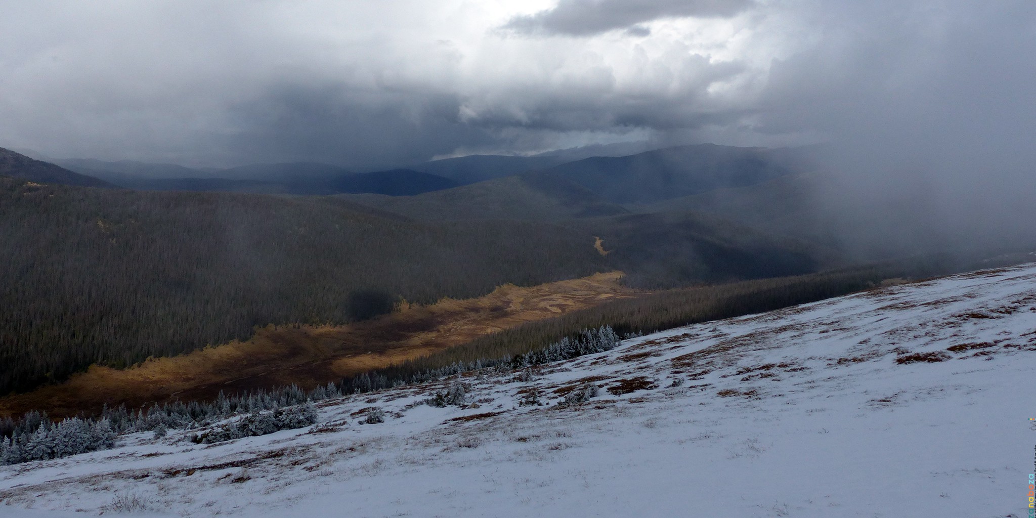En inderdaad. Mist. Prachtig was het om te zien hoe de mist aftekende tegen de sneeuw die er inmiddels ook lag. We hoopten nog dat als we hoger zouden komen, we wel boven de mist uit zouden komen. Op het moment dat onze hoogtemeter 3713 meter aangaf, waren we op het hoogste punt van de dag. Gelukkig voor ons, was er aan de omgeving niets veranderd. We maakten een stop en genoten van het uitzicht in de ijzig koude wind.