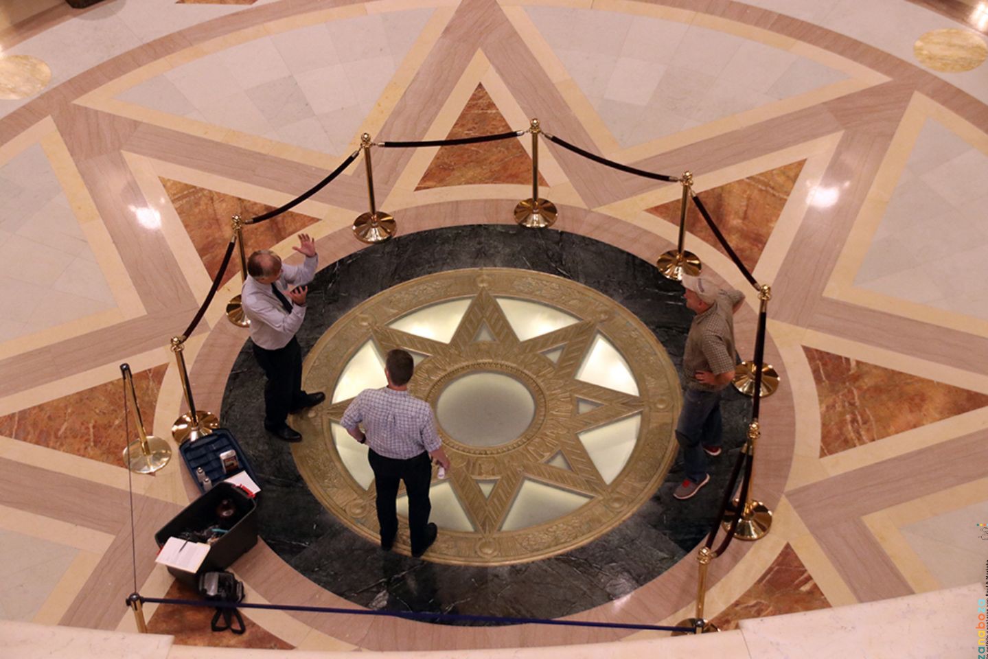 Nadat we ons keurig hebben gemeld mogen we rondlopen in het gebouw. Het eerste dat we doen is naar de enorme koepel lopen. De koepel in dit gebouw is de op één na grootste koepel ter wereld (alleen de St. Pieter in Vaticaanstad heeft een grotere koepel). Om de één of andere reden maak ik altijd graag een foto van een koepel recht van onderen. Ik heb geluk, want hoewel er een afzetting is in het midden van de ruimte, heeft men één touw opengelaten. En dat betekent dat ik er gewoon mag gaan staan. Ik maak de foto en al snel staat er een man. Hij is vergeten het ene touw dicht te maken en er mag niemand op het koper gaan staan. Dit wordt vandaag gerenoveerd omdat het groen uitslaat van de schoenen van alle toeristen die erop gaan staan. Soit, de foto die ik wil hebben is gemaakt en in de tijd dat de man mij alles aan het uitleggen is, is Marieke stilletjes achter mij doorgewandeld om voor de zekerheid ook een foto van de koepel van recht van onderen te nemen.