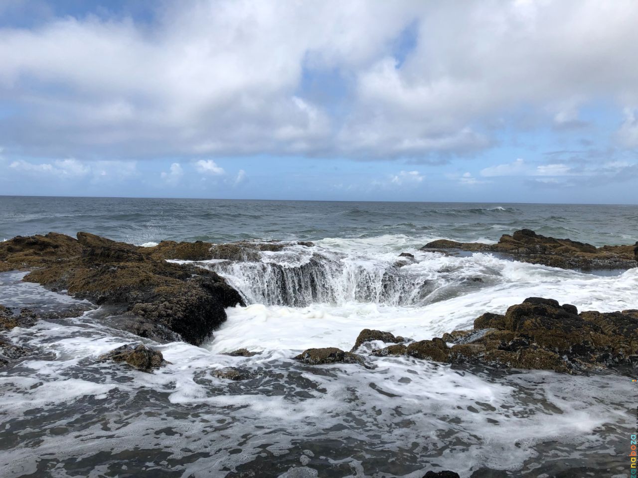 De volgende stop staat al een paar jaar op het wensenlijstje. Thor’s Well. We verwachten er niet heel veel van, want om de beste foto’s te kunnen maken, dien je er kort na vloed te zijn. Als wij arriveren is het alweer bijna eb. We parkeren de auto en wandelen naar dit natuurfenomeentje. Alhoewel het niet de meest ideale tijd is om er foto’s van te maken, genieten we wel volop en zijn we onder de indruk van deze put.