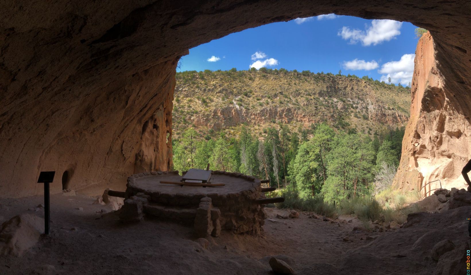 Voor vandaag staat een gemiddelde rijdag op de planning. Eerst iets meer dan een uurtje naar het park dat we vandaag willen bezoeken, en daarna ruim 250 kilometers richting het hotel. Tot zover de planning. De realiteit zou iets anders laten zien aan het einde van de dag. Als eerste rijden we ruim een uur naar een stadje, waar we een opgeloste puzzelcache gaan zoeken. Waarom? Wel, we hebben een challenge-cache gezien, waarvoor je in 15 verschillende counties van New Mexico een cache moet hebben gevonden. In 7 van die counties, dient een uniek cache type gevonden te worden. De 15 counties hebben we inmiddels gevonden. En in totaal vijf verschillende cachetypes. Een puzzel-cache hadden we nog niet gevonden. Dat was dus het eerste doel. Na een korte, maar pittige wandeling vertrekken we richting Bandelier NP.