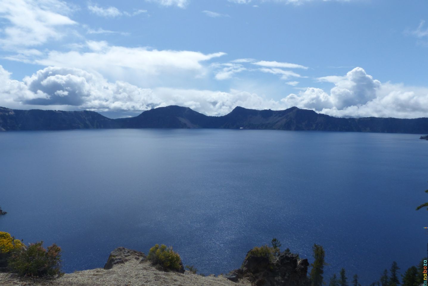Na genoten te hebben van de waterval, dienen we nog verder naar het oosten te rijden. Als we bij de waterval wegrijden, begint het weer te regenen. Na twee uur rijden arriveren we in het eerste Nationale Park dat we deze reis aandoen: Crater Lake. We hebben dit meer al eens bezocht tijdens onze rondreis in 2009. Als we het park inrijden, stopt het met regenen. Alles wat je hier ziet is een meer. Wel een groot meer, maar het is en blijft een meer. En ook een schitterend meer, maar het is en blijft een meer. We stoppen regelmatig, en maken vele foto’s van dit meer. We besluiten om in de auto te eten, omdat het maar 6 graden is. We parkeren de auto wel dusdanig dat we een fraai uitzicht op het meer hebben. Met zo’n uitzicht smaakt het allemaal toch naar meer.