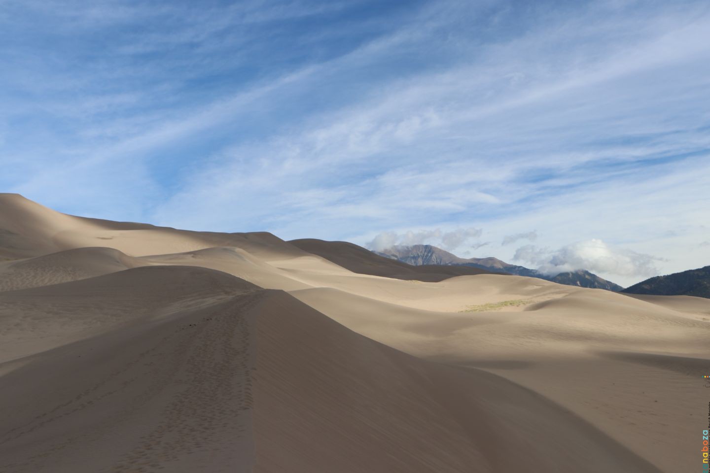 Zoals gewoonlijk stonden we vandaag weer op een mooie tijd op, zodat we volop van de dag kunnen genieten. Bovendien was het niet zo erg om het hotel op tijd te verlaten. Even koffie halen, auto tanken en op pad naar de eerste bestemming voor vandaag. Great Sand Dunes National Park. Het bijzondere aan dit park is, dat je zandduinen en bergen in één beeld kunt zien. We hebben geen idee waar je zoiets nog meer kunt zien. Om iets voor half negen reden we het park al binnen. We waren zelfs te vroeg om de medewerkers van het bezoekerscentrum te kunnen ontmoeten. Dan zelf maar even kijken wat we precies in dit park kunnen doen. Als je even hier rondkijkt, dan is het niet zo heel moeilijk om iets te bedenken. Je kunt hier een duinwandeling maken. Of een duinwandeling. En als je dat niets lijkt, dan kun je altijd nog een duinwandeling maken.