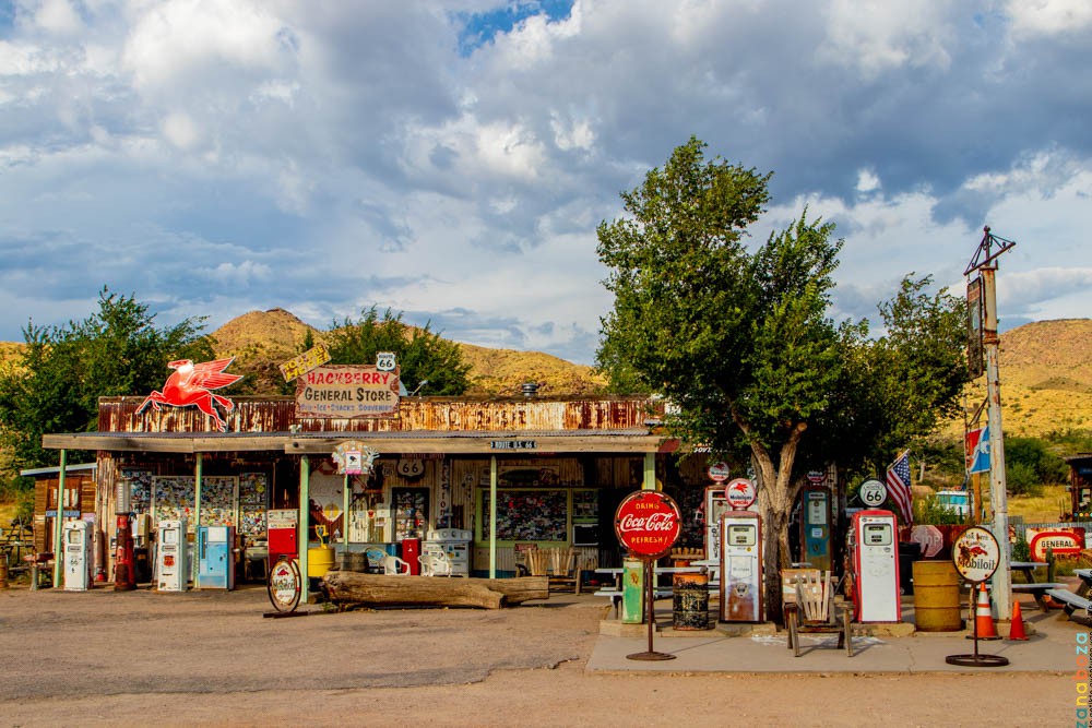 Onderweg stoppen we in Hackberry. Een stop die bij mij persoonlijk hoog op het lijstje staat. Mede door een foto die op internet rondgaat. Een oude, haast vervallen winkel met bijbehorende benzinepompen en daarvoor geparkeerd een Chevrolet Corvette cabriolet in perfecte staat uit 1956. We parkeren de auto. De winkel is inderdaad behoorlijk vervallen. De benzinepompen doen al jaren geen dienst meer. Maar de Corvette is in geen velden of wegen te bekennen. Toch maken we de foto, want het is zeker de moeite waard om vast te leggen. We lopen de winkel in, en kijken wat rond. In een hoekje zien we kentekenplaten liggen. We snuffelen wat rond, en even later verlaten we de winkel met twee exemplaren van Staten die we nog niet hadden. Eerder op de dag hebben we ook al een exemplaar gekocht dat nog niet in de collectie zit. Nog 5 platen te gaan, en we hebben van alle staten en DC een kentekenplaat op onze schuur hangen.