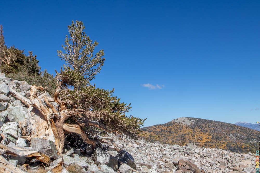 We wandelen op het gemak naar boven. Zuurstof is toch een stuk minder op deze hoogte. Eigenlijk is dat het enige dat deze wandeling zwaar maakt. De steilte valt wel mee, en ook de ondergrond hebben we wel eens slechter gehad. We genieten van de herfstkleuren van de Aspen-bomen. Langzaamaan komen we hoger, en wordt de begroeiing steeds minder. We maken een wandeling door een Bristlecone bos en zien een exemplaar van 3200 jaar oud. Wat ook bijzonder is aan deze bomen is het feit dat het heel goed mogelijk is dat een deel van een boom al een paar duizend jaar dood is, terwijl een ander deel van de boom vrolijk verder leeft. Ook de naalden van de boom worden gemiddeld maar liefst 40 jaar oud. Bij andere naaldbomen is dat over het algemeen een jaar of 2.