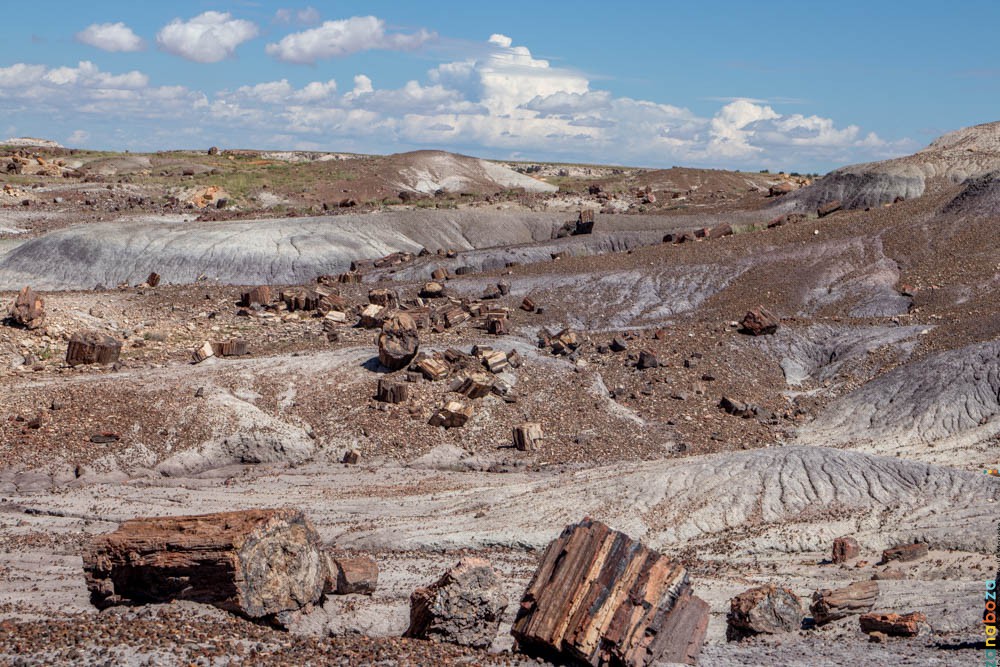 Het eerste deel van het park is Painted Desert. Eigenlijk gewoon Badlands zoals we die al vaker hebben gezien. Maar daarom niet minder mooi. We stoppen verschillende keren om foto’s en wandelingen te maken. Als we bij een achtergelaten Studebaker arriveren, rijden we het Noordelijke deel van het park al weer uit. Het zuidelijke deel vinden wij dan ook stukken interessanter. Aan dit deel dankt het park zijn naam. Hier is een versteend woud te vinden. Althans, wat ervan over is. Men moet zich voorstellen dat op deze plek 220 miljoen jaar geleden een bos was. Dat is destijds plotseling ondergelopen, en onder een sliblaag terechtgekomen. Hierdoor raakte de boomstammen in de loop van enkele miljoenen jaren versteend. Door het veranderende klimaat verdween de sliblaag weer en kwamen de versteende boomstammen weer bovengronds te liggen.
