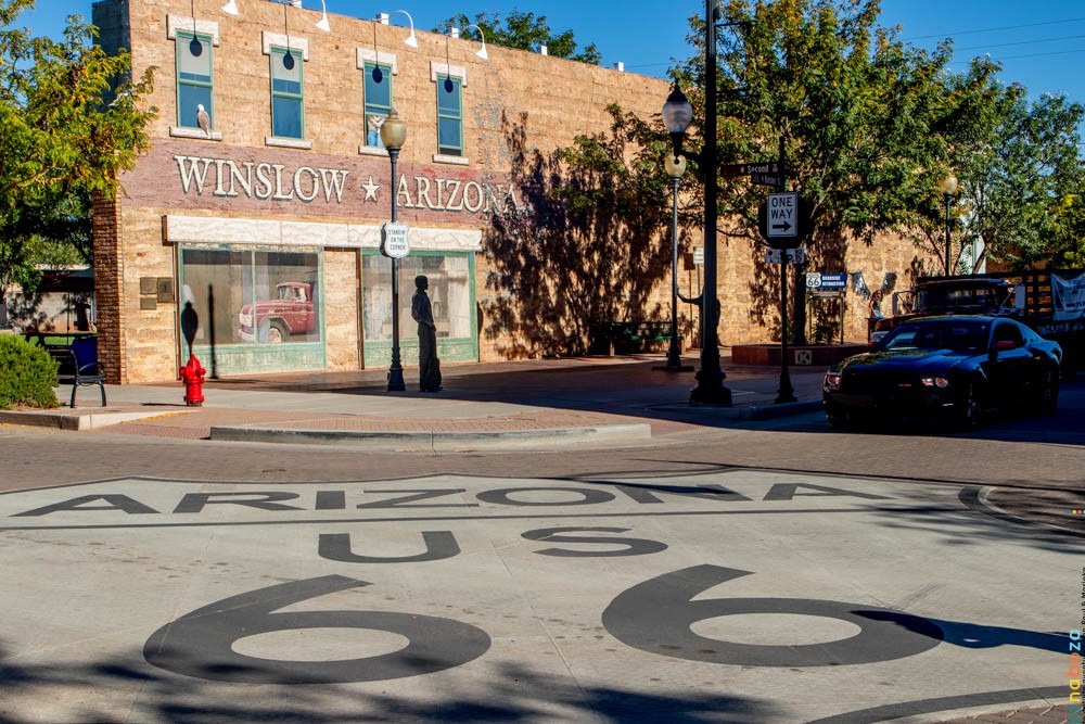 Voor vandaag hebben we als eerste een bezoek aan Winslow, Arizona op de planning staan. We willen daar op de hoek staan, zoals The Eagles al zongen in hun eerste hit uit 1972. Inderdaad, “Take it easy”. Doe het rustig aan. Dat doen we dan ook. We vragen ons af hoe het mogelijk is, dat een plaatsje kan leven op een regel tekst uit een liedje. Hoe het ook zij. We nemen de songtitel ter harte en doen het rustig aan. Ook omdat het al behoorlijk warm is, ondanks dat het pas iets over 8 uur in de ochtend is. Voordeel van dit tijdstip is ook dat het zo rustig op de hoek in Winslow, Arizona is dat we rustig aan kunnen doen.
