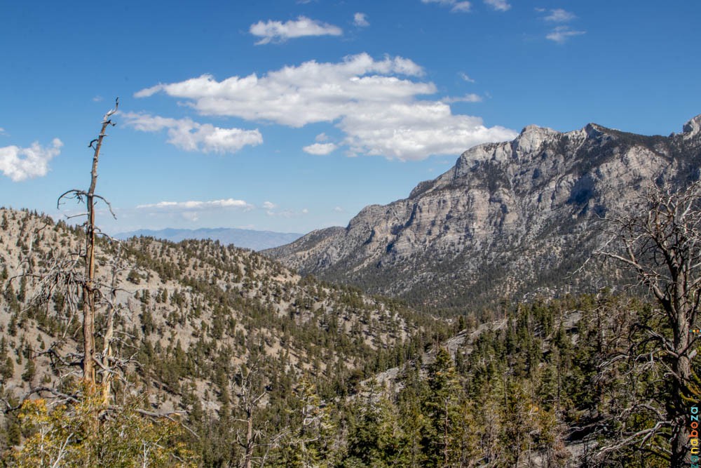 Onderweg vinden we zo nu en dan een geocache. Ook laten we er een behoorlijk aantal links (en rechts) liggen, omdat we vinden dat de klim (of afdaling) naar de cache te gevaarlijk is voor ons kneuzen. Kort na de lunch belanden we op het hoogste punt van de wandeling. Hier slaan we het pad op naar de Lower Bristlecone Trail. Het pad is hier heel anders. Vrij gelijkmatig en ook behoorlijk breed. Een auto zou er zonder problemen overheen kunnen rijden.