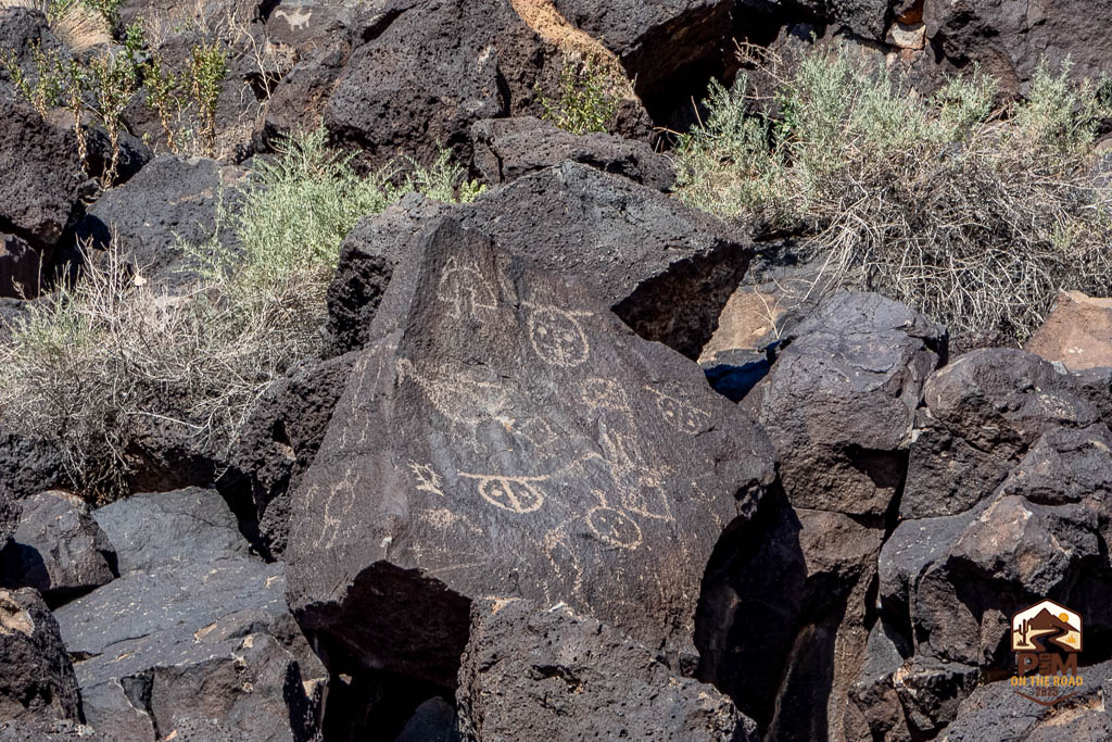 We rijden tevreden weer een stuk verder en lunchen in de auto. Zo hebben we meer tijd over om straks nog even een wasje te draaien in het hotel. De laatste stop van vandaag zou ons petrogliefen laten zijn in Petroglyph National Monument. Het bezoekerscentrum is tot 16:30 uur open dus we waren nog ruim op tijd om even een speldje te scoren om aan de collectie toe te voegen. Het is een bezoekerscentrum dat totaal anders is dan we van de nationale parken en monumenten gewend zijn. Er is een klein hokje waar een ranger keurig uitlegt wat er in het park te zien is. We kunnen kiezen uit drie verschillende rondwandelingen van verschillende lengte. Degene die eigenlijk op de planning stond, is het toch niet geworden. Om daar de pertrogliefen te kunnen zien, was het raadzaam om een verrekijker bij de hand te hebben. En aangezien we toch al niet snel de tekeningen ontdekken, hebben we maar voor de populairste wandeling gekozen waar we ruim 400 pertrogliefen zouden kunnen zien. Met een lengte van een kleine 3,5 kilometer ook prima te doen. We zien er op de route inderdaad best veel. Maar ze kunnen toch zeker niet tippen aan degene welke we eerder in Dinosaur NM hebben gezien. In Dinosaur NM hebben we geleerd dat de mensen in die tijd gelukkig waren als ze alles op orde hadden en tijd over hadden om zichzelf creatief te uitten, onder andere in het maken van muurschilderingen. Nou aan de hoeveelheid in dit park te zien, woonden hier de gelukkigste mensen op aarde. Toen was geluk nog heel gewoon…